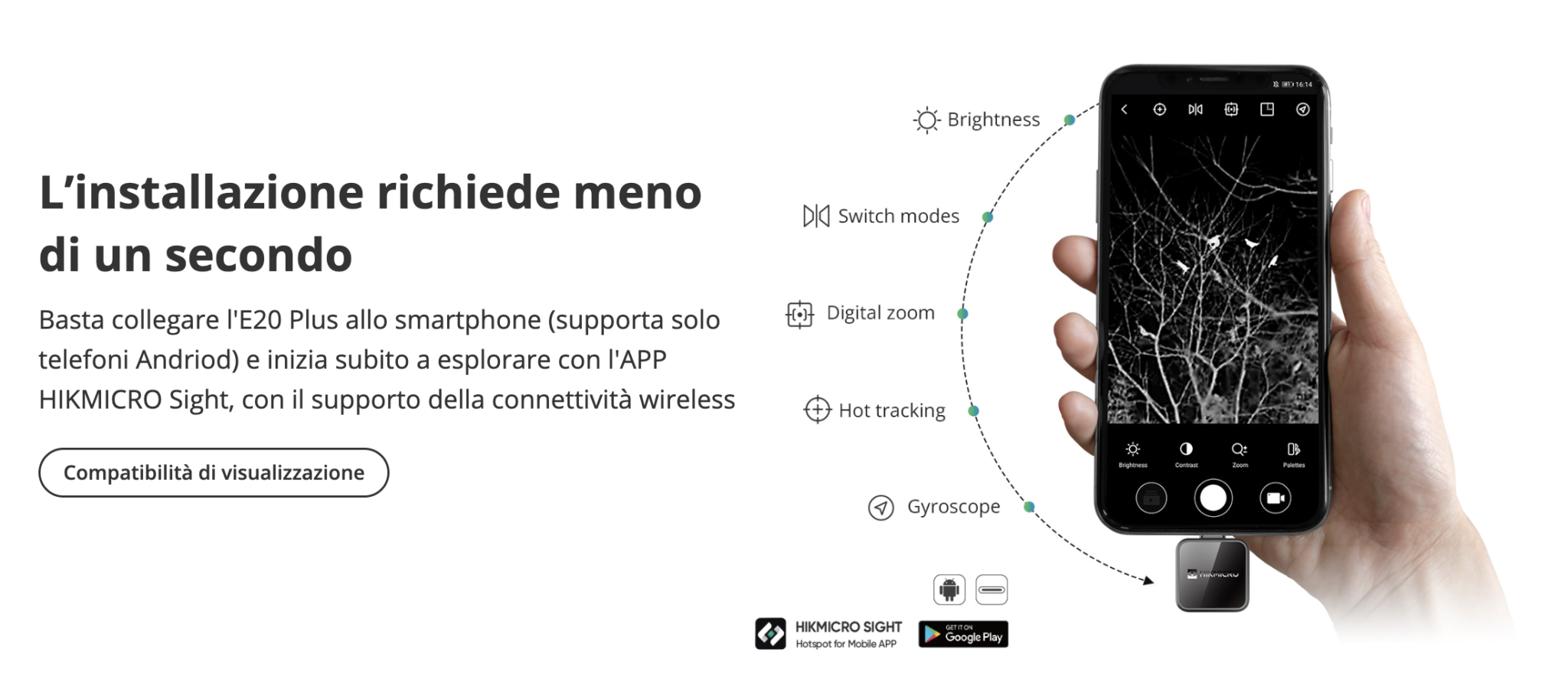 Hikmicro Explorer E20 Plus porta il concetto di termocamera compatta a un livello completamente nuovo. Hikmicro Explorer E20 Plus è un dispositivo in miniatura progettato per funzionare con gli smartphone. A causa del fatto che vengono utilizzati sia la fonte di alimentazione che il display del telefono, la struttura del dispositivo è notevolmente semplificata. Grazie a ciò, è possibile ridurre sia il prezzo della termocamera che le sue dimensioni. L’utilizzo dell’interfaccia USB-C rende Hikmicro Exploret E20 Plus compatibile con la maggior parte degli smartphone Android disponibili sul mercato: ecco un elenco dei modelli compatibili